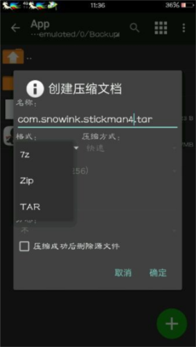 6. 打开ZArchiver,将原tar压缩包重命名并复制其名称,之后可删除原包;接着长按修改后的data文件,选择压缩,格式仍为tar。