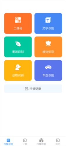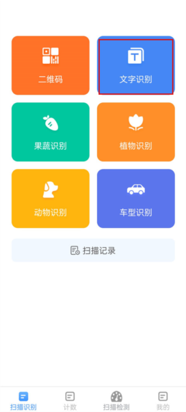 1、打开软件,可以看到多种功能选项,包括文字识别、果蔬识别、植物识别、动物识别等;这里以文字识别为例,点击进入该功能。