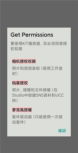 1、完成kihno player最新版本的下载与安装后,首次进入软件需根据提示授予相应的设备权限;