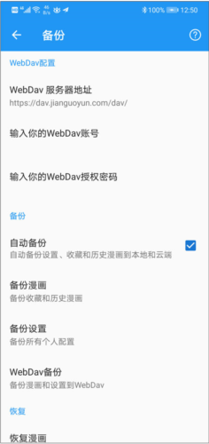 自动备份说明:开启相关选项后,每次退出应用或累计打开漫画达到一定次数,软件会自动执行备份任务;配置好WebDav服务器后,备份数据将上传至云端。