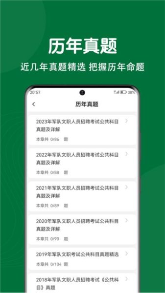 1. 历年真题演练:软件包含大量军队文职考试历年真题,方便用户进行实战模拟,有效积累考场经验。