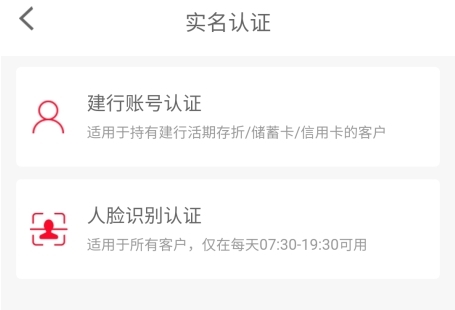 2、进入认证页面,可选择建行账号认证或人脸识别认证;