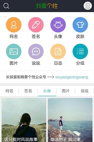 3.头像:包括情侣头像、女生头像、男生头像、卡通头像、静物头像及微信头像;