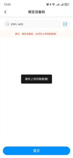 使用安捷赛鸽APP绑定设备码前必需上传赛鸽匹配数据,不然无法绑定,会提示如下图“请先上传匹配数据!”。