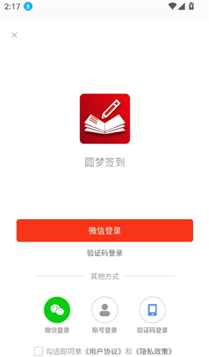 1、在本页面下载圆梦签到应用,安装后打开并同意相关隐私政策;