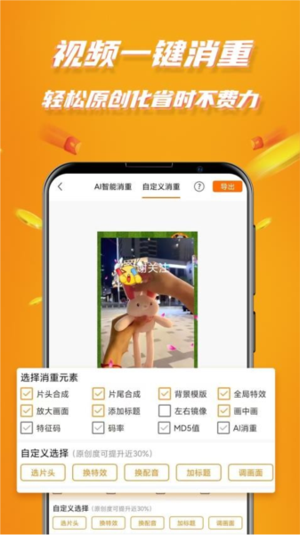 8、内置工具箱提供视频消重、去水印、封面提取、音乐替换等剪辑功能。