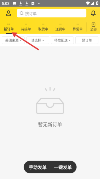 2、订单管理页面设有搜索栏,并划分新订单、待接单等多个分类;页面会显示当前订单状态,支持手动与快速发单功能。