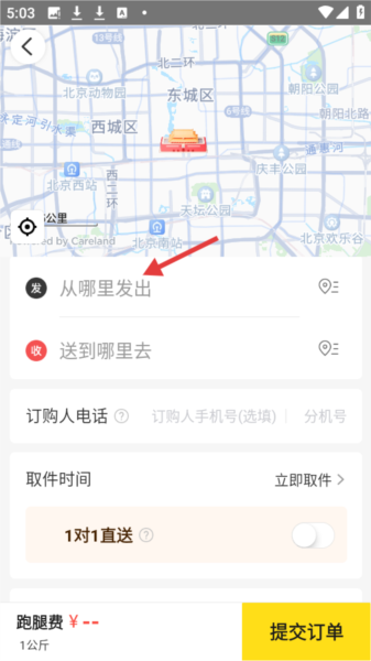 3、订单填写界面以北京地图为背景,需要填写发件与收件地址、联系人电话等信息;还可设置取件时间并最终提交订单。