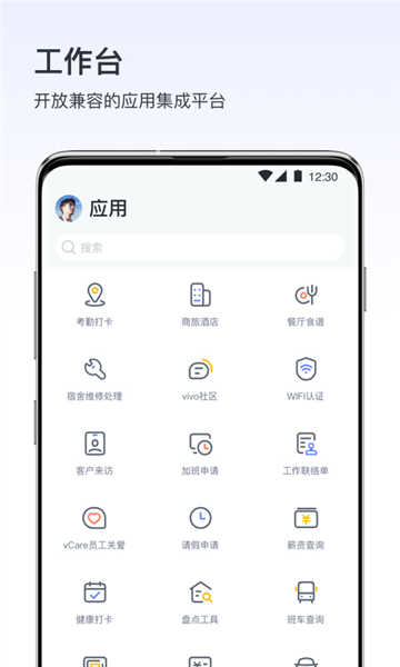 3、工作台集成了考勤打卡、加班申请、薪资查询、客户接待等多种功能,满足日常办公需求;