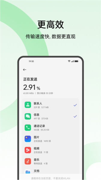 界面会贴心提示数据传输的剩余时间,搬家进度清晰可见。