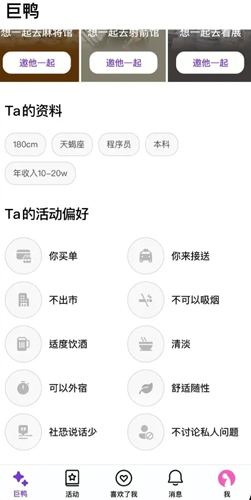 精准匹配机制:根据用户设定的个人偏好,精确推荐潜在的活动玩伴,促进更有共鸣的互动。