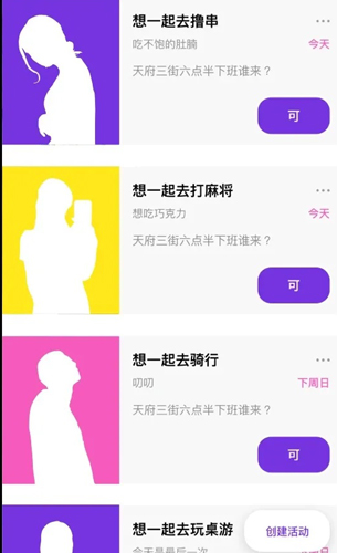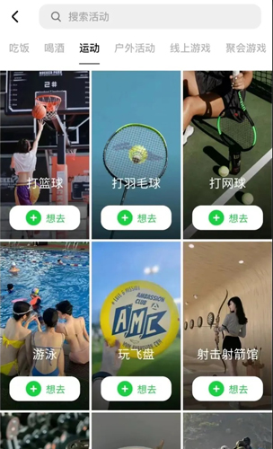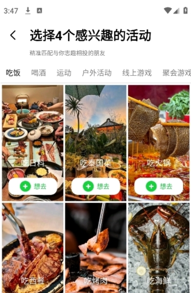 然后选择感兴趣的社交活动类别,例如吃饭、运动或游戏。