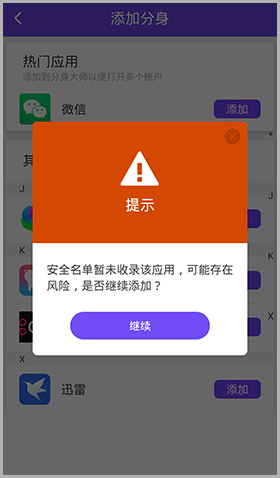 尝试添加微信时,软件可能会提示“安全名单暂未收录该应用,可能存在风险,是否继续添加”。