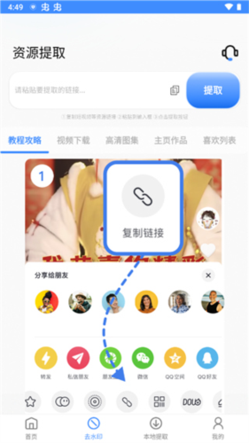 1、打开软件,选择去水印功能,将其他平台的视频分享链接复制到提取框中;