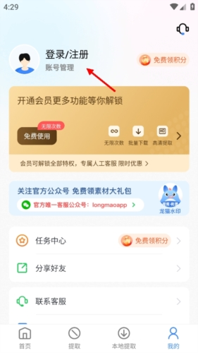 进入个人页面后,点击顶部的“登录/注册”选项;