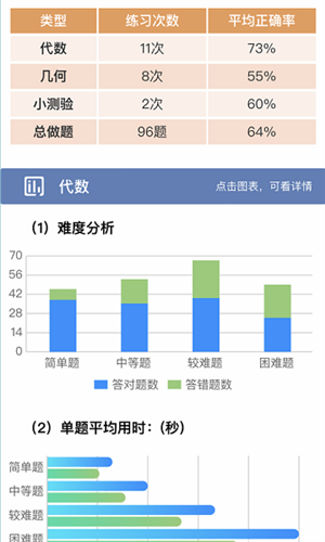 该应用题库与国内各版本初中数学教材同步,题目按年级、知识点及难度细致分类;