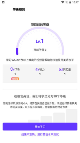 1、启动软件后,人工智能系统需初步评估你的英语水平,你可以从三个预设选项中选择一项,或直接完成水平测试;