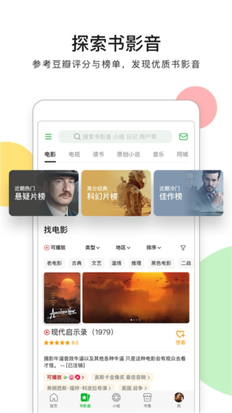 2、拥有庞大的影视音像资料库,能帮你迅速找到喜爱的电影、剧集、图书与音乐。你可以查阅评分与评论,获取真实可信的反馈;也能通过各类榜单、片单进行系统性的探索,梳理自己的兴趣脉络。你的每一次标记与评论都会成为独特的文化足迹。