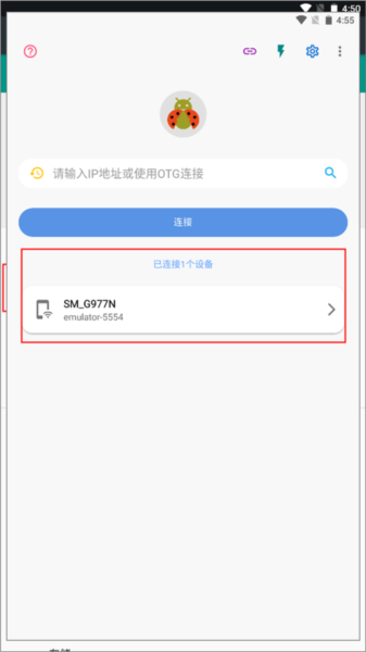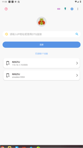 4、在控制设备上打开甲壳虫ADB助手,输入被控手机的IP地址与端口,点击连接即可。