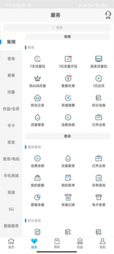 2、应用还提供流量、套餐、权益会员等多种服务项目。