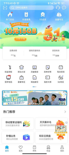 1、下载并打开河南移动网上营业厅应用,登录账号后,在首页可便捷查询话费、剩余流量和语音通话时长。