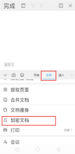 2、打开已有文档后,点击底部工具栏,在“文件”菜单中找到“加密文档”选项进行设置。