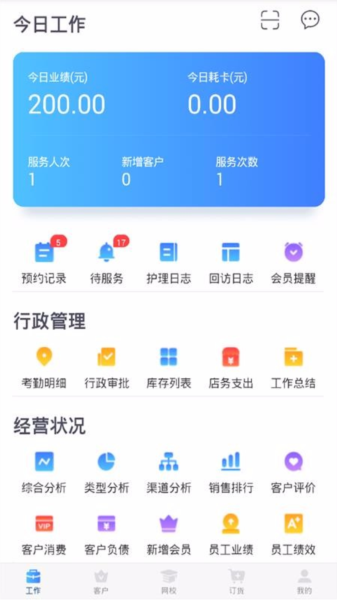 3、每日统计并呈现业绩数据,如今日业绩、耗卡金额、服务人次与新增客户;