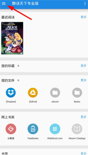 1、若想在软件内搜索书籍,可先点击左上角菜单按钮,进入个人功能列表进行操作。