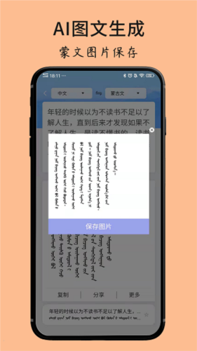 1、支持蒙古语与汉语的智能互译,翻译结果能以图片形式保存并分享;