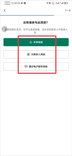 4、创建完成后,可以将邀请链接发送给团队成员,或通过联系人或电子邮件添加他们。