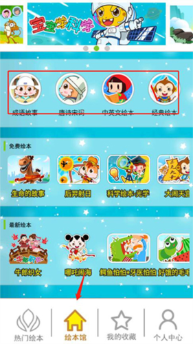 1、在首页选择绘本馆入口,馆内分类包含成语故事、唐诗宋词、中英文绘本及经典绘本等。