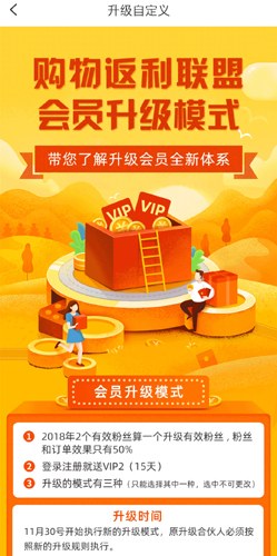 VIP会员共分9个等级;不具备发展下线条件的会员可转为导购身份,导购不享受粉丝带来的分成收益。