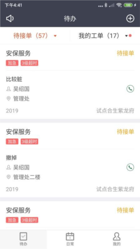 该应用允许用户高效录入各类工单,操作流程简单直接;在平台内,工单的加急标识与超时状态清晰呈现,便于优先处理;一键查询功能让用户全面掌握工单进度与完成状态;待办列表集中展示所有待接任务,支持快速响应;内置电话功能可直接联系业主,及时沟通问题;用户可统一查看个人负责的全部工单,确保任务按时完结;仓库管理模块实时更新库存数据,简化出入库操作。