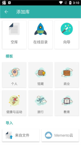 首先需要在Memento Database(后文简称MD)中创建一个“库”。点击主界面或右上角菜单,选择“添加库”。MD内置了许多常用模板,如音乐专辑、书籍、电影等。以下以电影为例,选择“电影”模板。