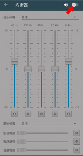 3、进入均衡器界面,默认处于关闭状态,所有设置项为灰色不可用;点击右上角启用开关。