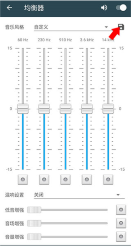 5、如需自定义配置,选择自定义选项,调整各频段参数后,点击右侧保存按钮即可存储个人设置。