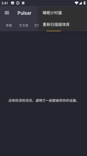 软件兼容MP3、AAC、FLAC、OGG、WAV等主流音频格式;若音乐未正常显示,可通过操作栏中的重新扫描库功能刷新设备内容。