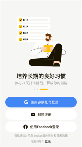1、下载安装Bookey后打开应用,进入登录界面,支持谷歌账号或电子邮箱登录。