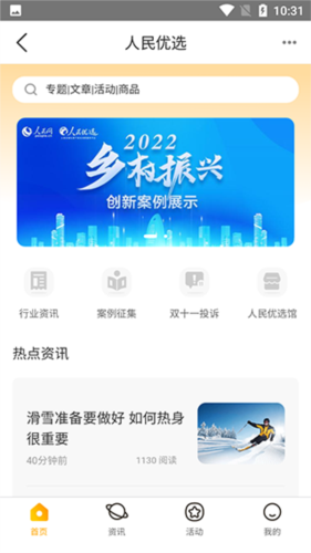 1、下载安装后打开应用进入首页,可见行业资讯、案例征集、人民优选馆等板块。
