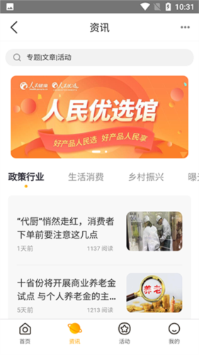 3、返回首页,点击底部资讯栏目,可阅读行业政策、生活消费、乡村振兴等相关信息。