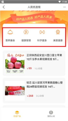 2、点击人民优选馆,即可浏览各类精选农产品及其售价,点击商品可直接购买。