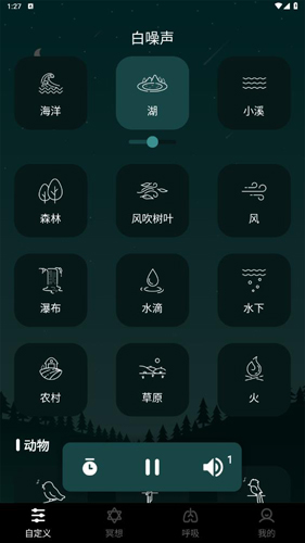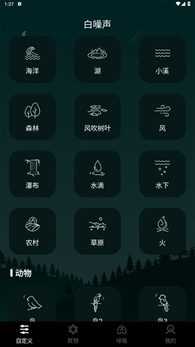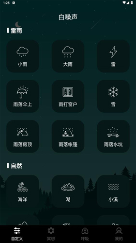 1、首先下载并打开软件,进入主界面后可以看到【自定义】选项;在这里你可以自由组合多种白噪音,创造出独一无二的声音环境。