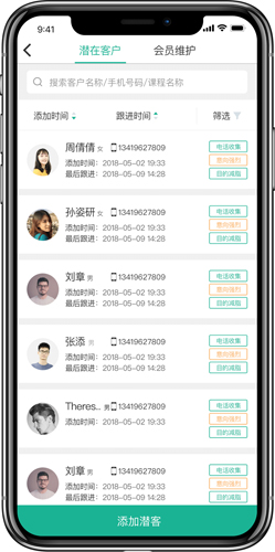 面向会籍:具备潜在客户添加与会员维护功能;可对潜客及会员信息进行添加维护与查询;支持使用文字或语音录入备注内容。
