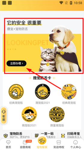 2、跳转至宠物管理页面,点击【立即办理】开始领取防丢卡。
