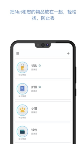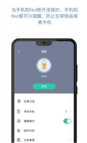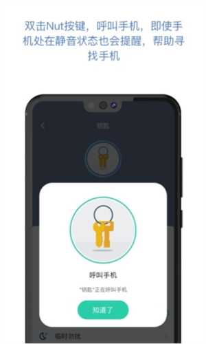 一键寻找物品,将nut附着在易丢物品上,若物品找不到,在应用内点击一键呼叫,nut便会发声;若手机遗失,按下nut按键,手机会响铃提示。