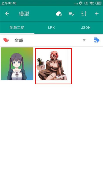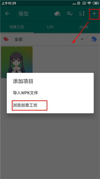 3、创意工坊。进入模型页后,点击右上角加号,再选择创意工坊选项。