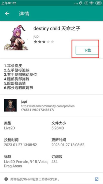 5、下载。打开具体桌宠可查看详细信息,点击下载按钮将所选桌宠保存至本地。