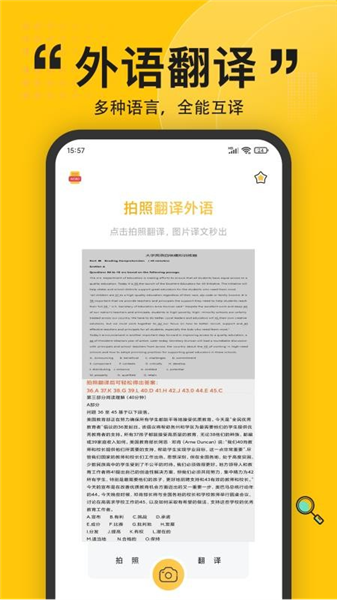 拍照英语翻译app由浙江新盘果信息技术有限公司开发,是一款专注于扫描与文字翻译的在线工具。你是否也在寻找一款能够直接录入并即时翻译文字的软件?现在打开应用即可体验。它提供专业的拍照翻译和语音翻译服务,支持数十种国际语言相互转换,无论是语言学习还是旅行外出,都能成为你的得力助手。