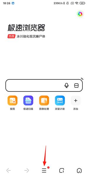 1、启动360极速浏览器,在搜索页面点击底部的三横线扩展菜单;