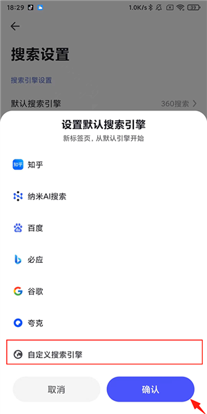 5、设置默认搜索引擎:如果列表中没有搜狗引擎,则点击下方的【自定义搜索引擎】;
